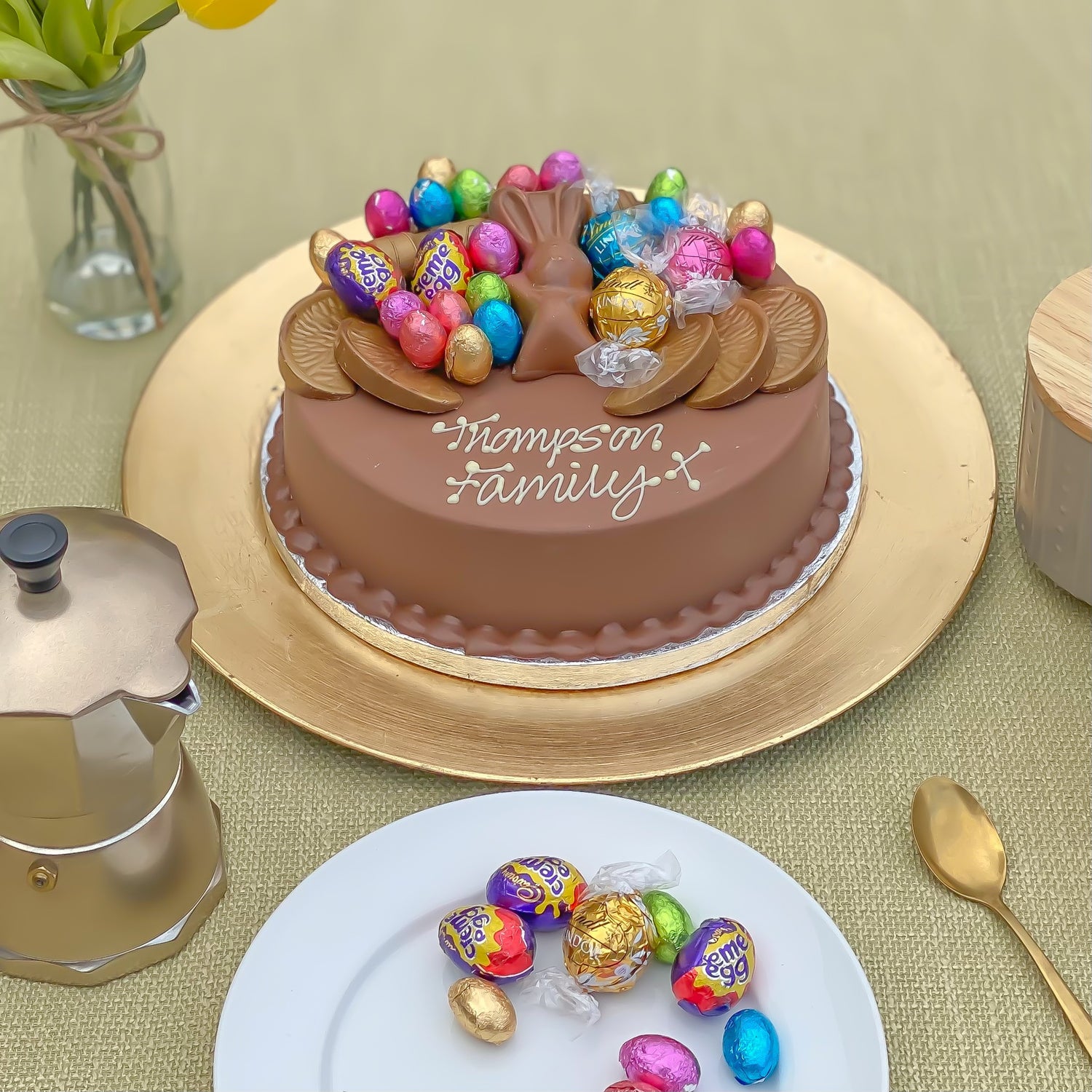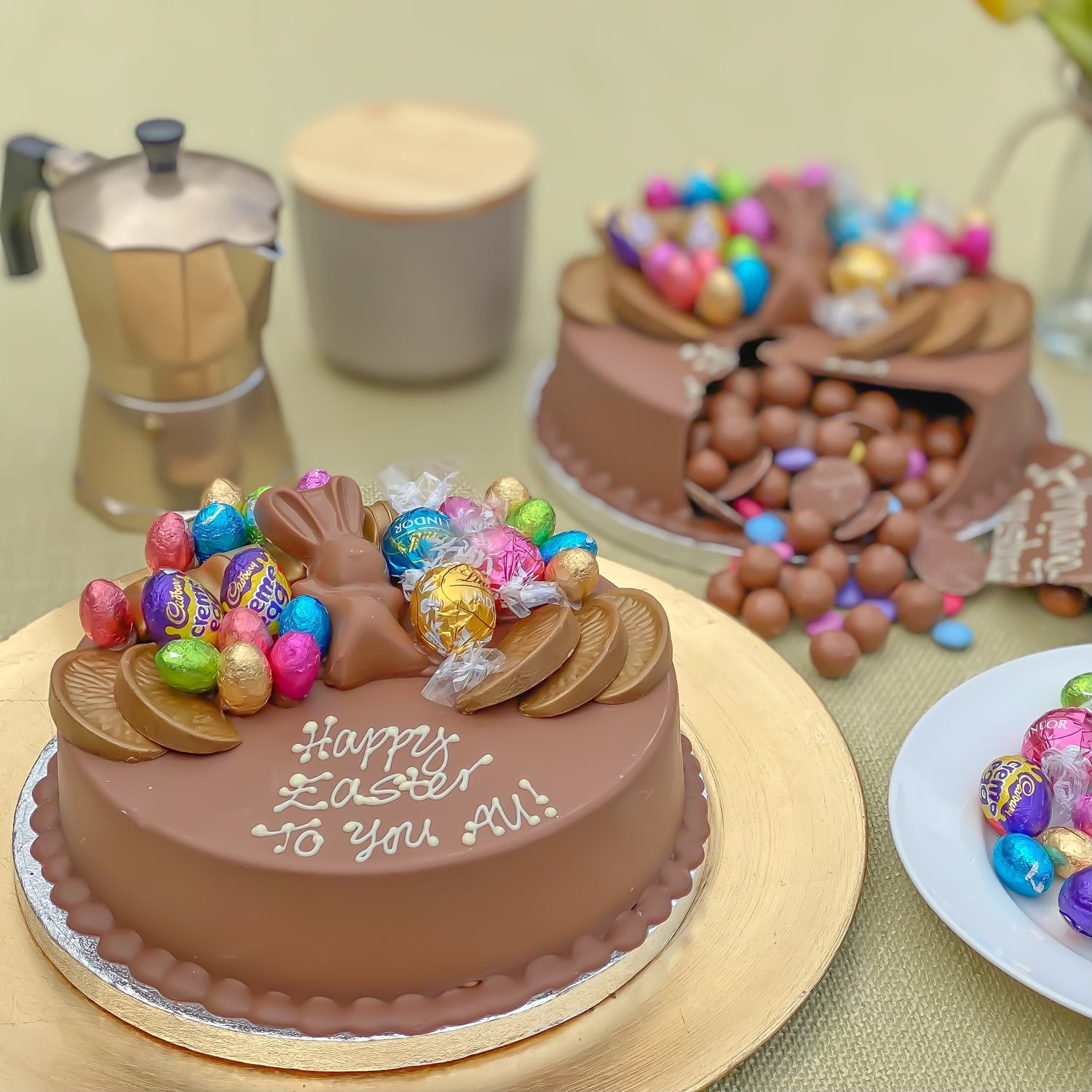 Made from deliciously smooth Belgian milk chocolate, this Smash Cake is adorned with an array of Easter confectioneries: A Malteser Bunny®, Foil Eggs, an assortment of Lindor® flavours, and Terry’s Chocolate Orange® segments and Bueno®, finished with gold lustre.